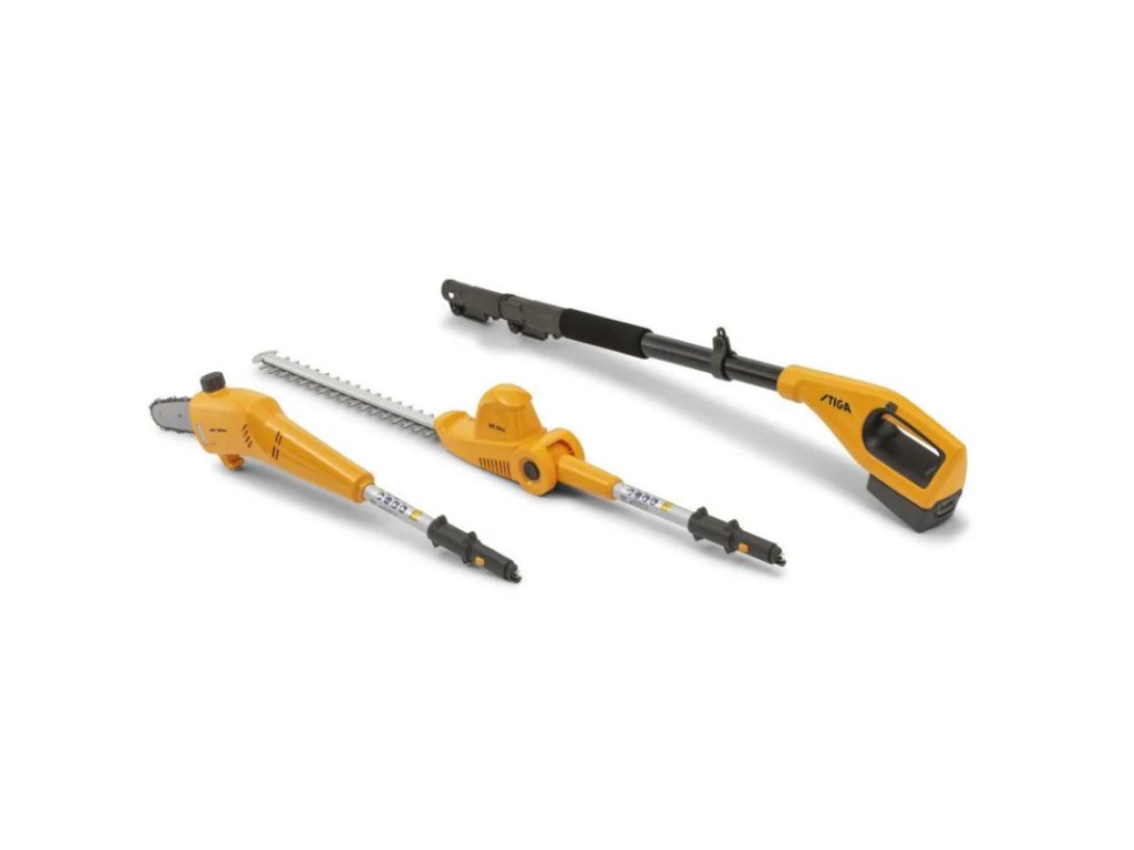 Stačí připojit nůžky na živý plot nebo prořezávací pilu, vysunout teleskopickou rukojeť a základní zahradnické práce zvládnete snadno a rychle – a to vše se stojem bezpečně ze země.