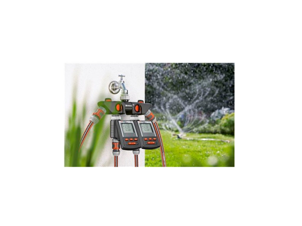 K čtyřcestnému rozdělovači lze připojit dva zavlažovací počítače nebo časovače od společnosti GARDENA.