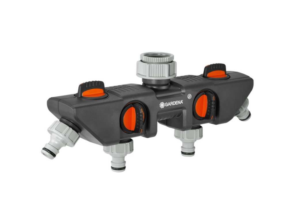 4-cestný rozdělovač od společnosti GARDENA slouží k současnému připojení několika zařízení k jednomu kohoutu.